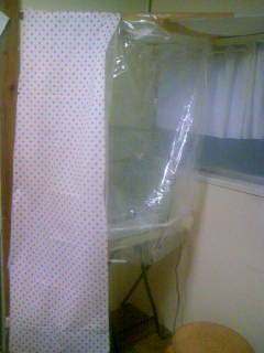 お布団カバーとごみ袋を駆使して作りました。まだ26度だからなんにもつけてないけど、ひえたらこれにデロンギを入れます。