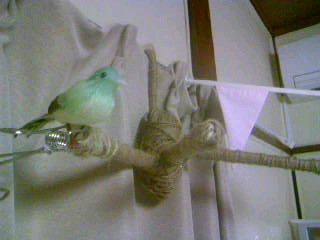 仮名ウグイスくんがとまっている枝みたいなものは、塩吉がいらなくなったフキンかけに百均で買った木の糸をぐるぐるしたものです。